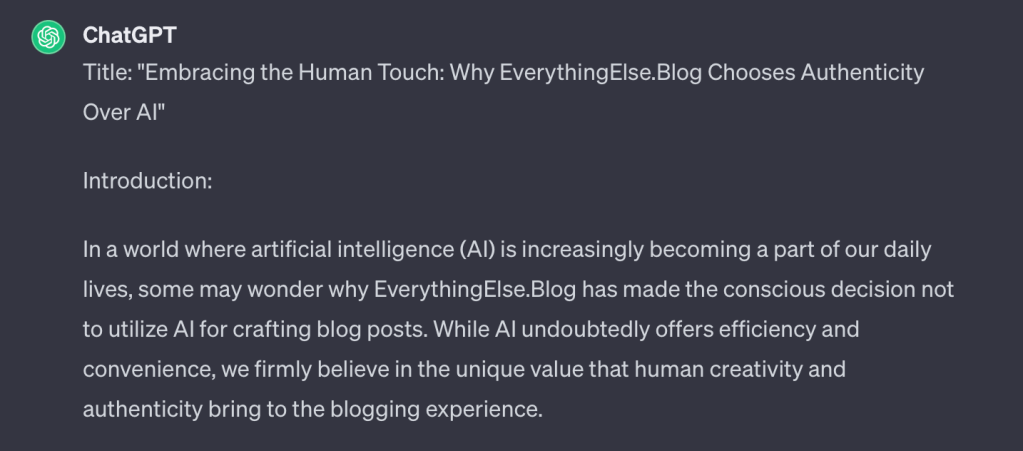 ChatGPT was referenced in most of the news articles that I read because of its use of advanced artificial intelligence that is already producing many online posts. When asking ChatGPT as an experiment to write a blog post as to why everythingelse.blog will not be using AI, it came up with a long article which was quite scary that you could use it with minor changes.
