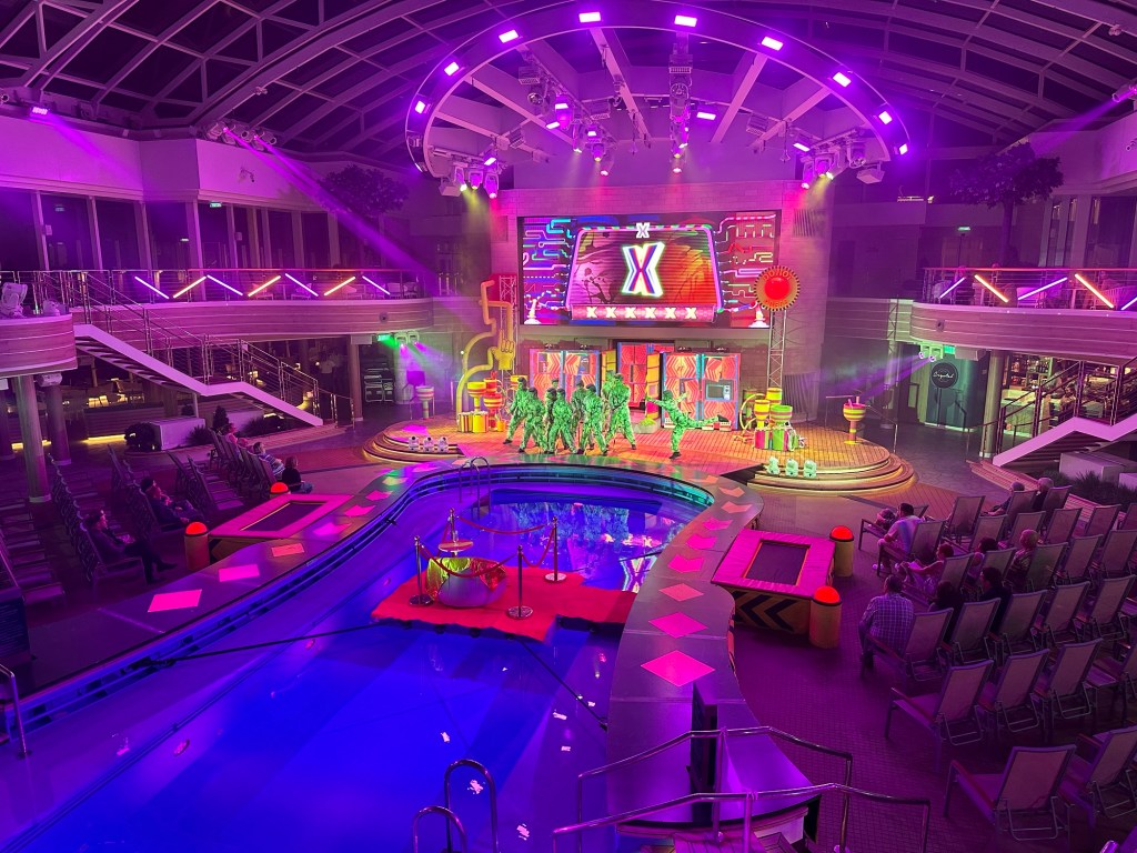 A non bookable show that you turn up early to watch and get the best seat that you can. We discovered that the first show was packed at 2100. Despite getting seats, we found our view blocked at times by passers by who stood in front of you! I enjoyed the show and wanted to experience with a better view. I then came back for the later show at 2230 and got an excellent view. A space adventure with song and dance. A little cheesy but great entertainment on a first cruise night in the Sky Dome.