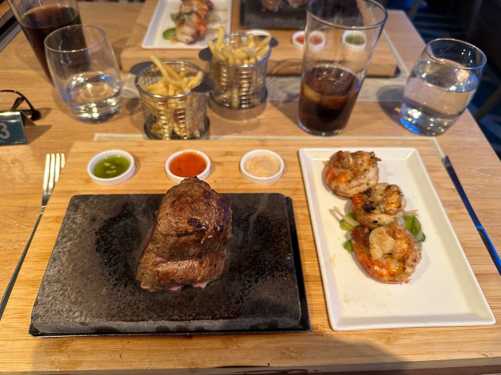 An excellent menu and we had three enjoyable courses. For one meal I had a massive nachos with cheese and chicken starter. For main a steak on a hot lava stone followed by a dessert sharer with marshmallows and strawberries to dip in chocolate. The king prawns with the steak were also amazing.