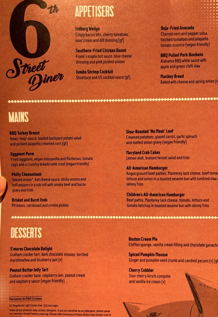 This restaurant offers fish and chips, curries and roasts with Yorkshire puddings. They also serve breakfast buffets with pancakes, egg dishes and usual cooked breakfast options. We had breakfast here quite a lot as on deck 8 as our cabin was on 10. We were then able to grab pancakes for our daughter and breakfast items. The breakfast items were also good.