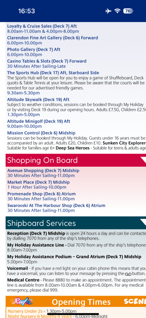 Too many to list but as you can see, other facilities/ship services include the gym, spa, art gallery etc.
