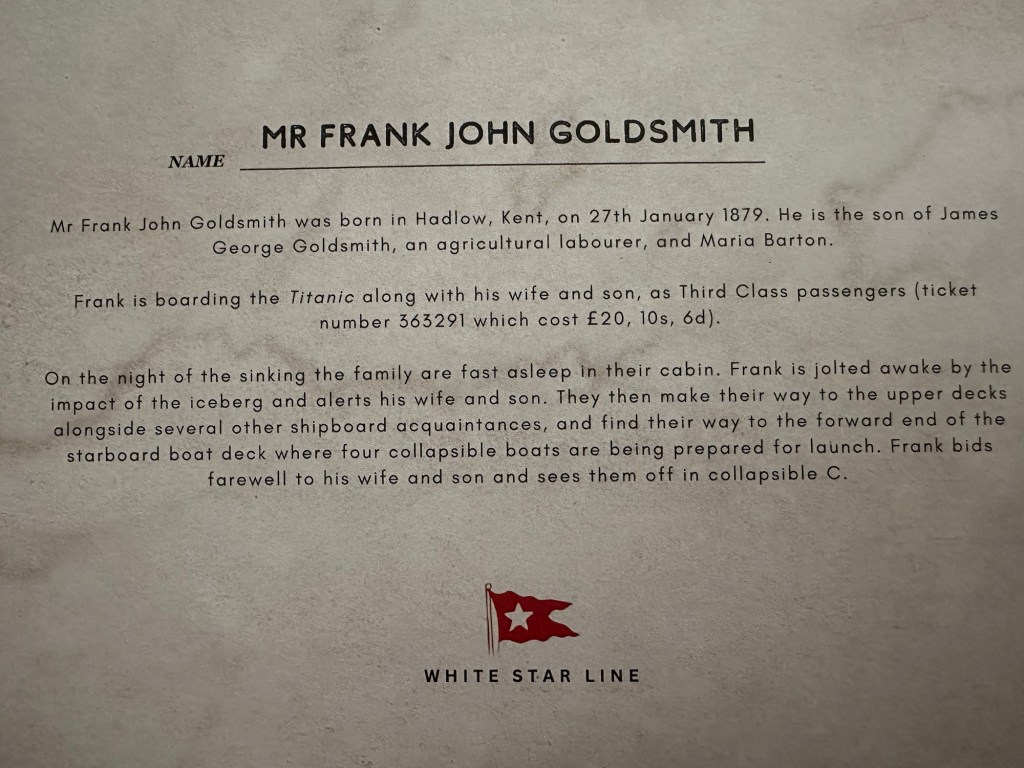 At the end I discovered that Mr Frank John Goldsmith, the name on my ticket died. RIP Frank – a nice way to keep the names alive of those onboard and paid an unwitting part of history.