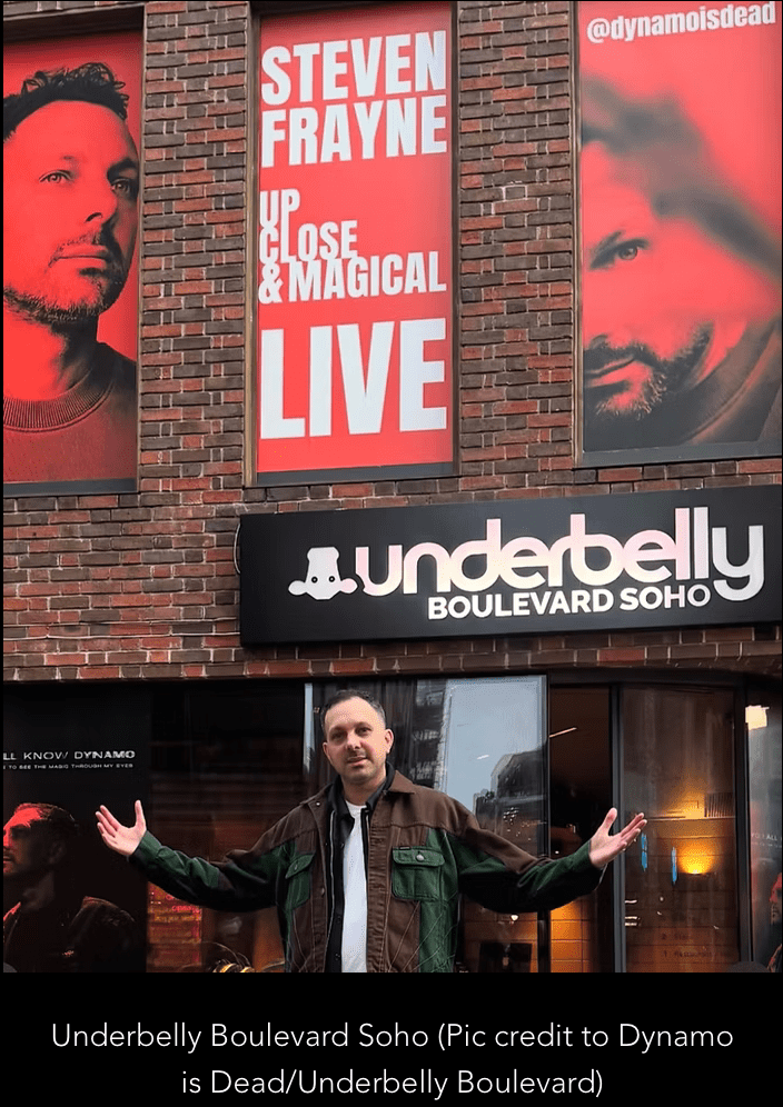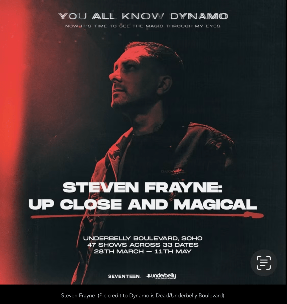 “A slick and well-received stage show which culminated in three standing ovations. Steven Frayne (Dynamo is dead) takes the audience on a journey where he reflects on his career, life’s challenges, and his illness while examining magic, tricks, and illusions. Demonstrating why he is one of the world’s leading magicians, he performs close-up magic while showcasing his skills to handle playing cards (cardistry), coins, signature moves, and much more. Throughout, Steven adds excellent narration and storytelling during this mesmerising show, while conveying a very sincere and vulnerable side of being human when talking about more personal subject matter. He leaves you with no doubt that he is genuinely enjoying himself on stage and that he is most passionate about sharing and creating magical experiences for all present. A confident and perfect set that was well received by a very receptive audience who are pleased to see Steven back on stage. Breathing new life into close-up magic with heavy influence from Steven’s/Dynamo’s street magic roots. The Underbelly Boulevard performance space/theatre setting in Soho is perfectly intimate and likely provides fantastic views for all during this very interactive show. The best and most entertaining of all the magic shows that I have witnessed which will be hard to beat, setting a new standard and expectation for others to achieve. Steven highlights throughout his set why he has gained the high levels of success. Don’t pass up on the opportunity to see Steven (aka Dynamo is dead) perform at close range. The must-see magic show of 2025!”