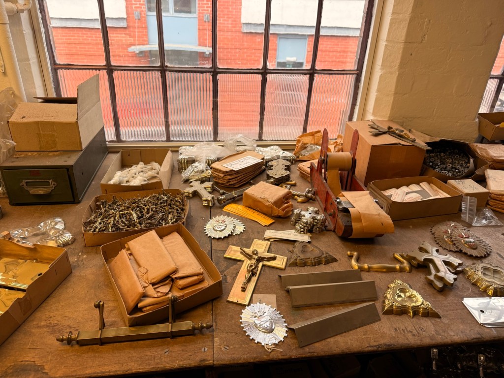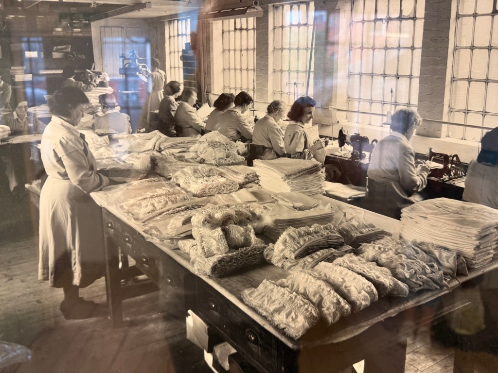 My write-up can’t do justice to how fascinating this museum is. The stamp room and machinery are just like the workmen are on break, with everything working perfectly and tools on display. I had a working demonstration of how the machines functioned and I was given an insight into how coffin furniture was designed and created. The warehouse that housed the furniture stock included catalogues and many different stock items on display and stored. Ordered items were then readied for dispatch and sent to the post room via lift. While you can’t touch the items, some workbenches hold display items that volunteers talk about. Upon entering the office, while old-fashioned by today’s standards, it would certainly have been modern for its time the mid-nineteenth century. The shroud room was also of interest, where fabric furnishings were created.