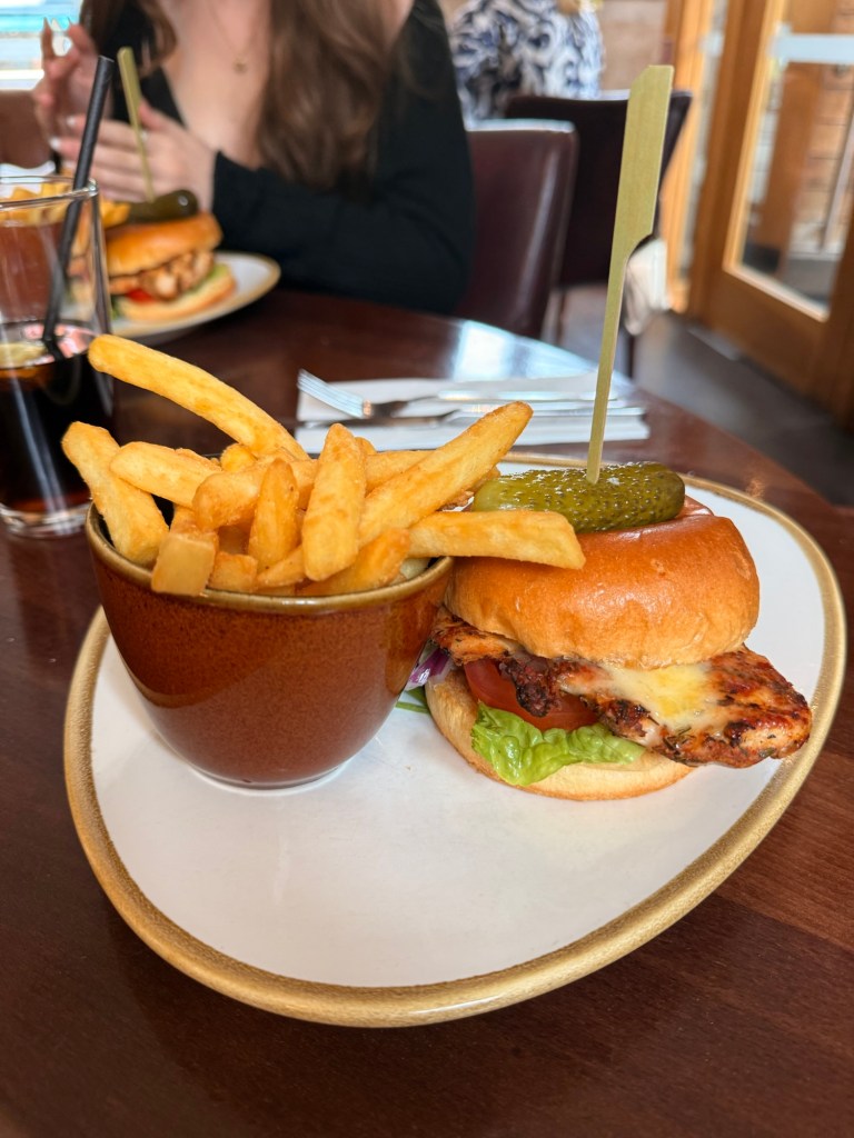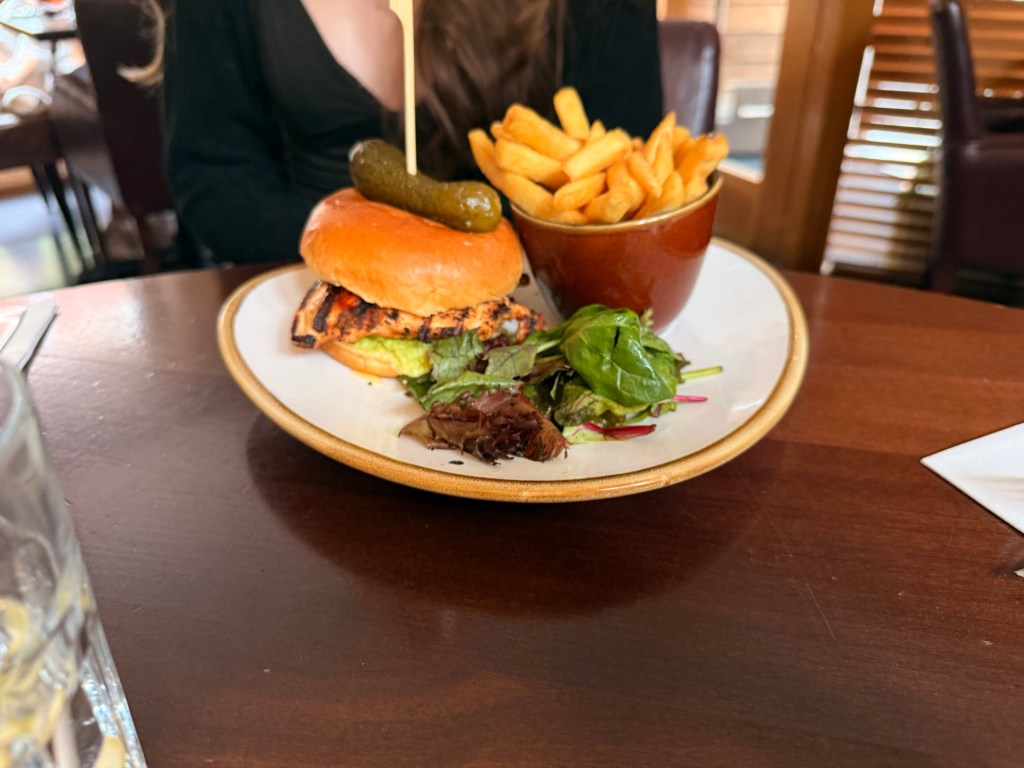 We all had different main courses. I had scampi and chips, while the rest of the party ordered cheese beef burgers and two Cajun chicken burgers, one of which had cheese.