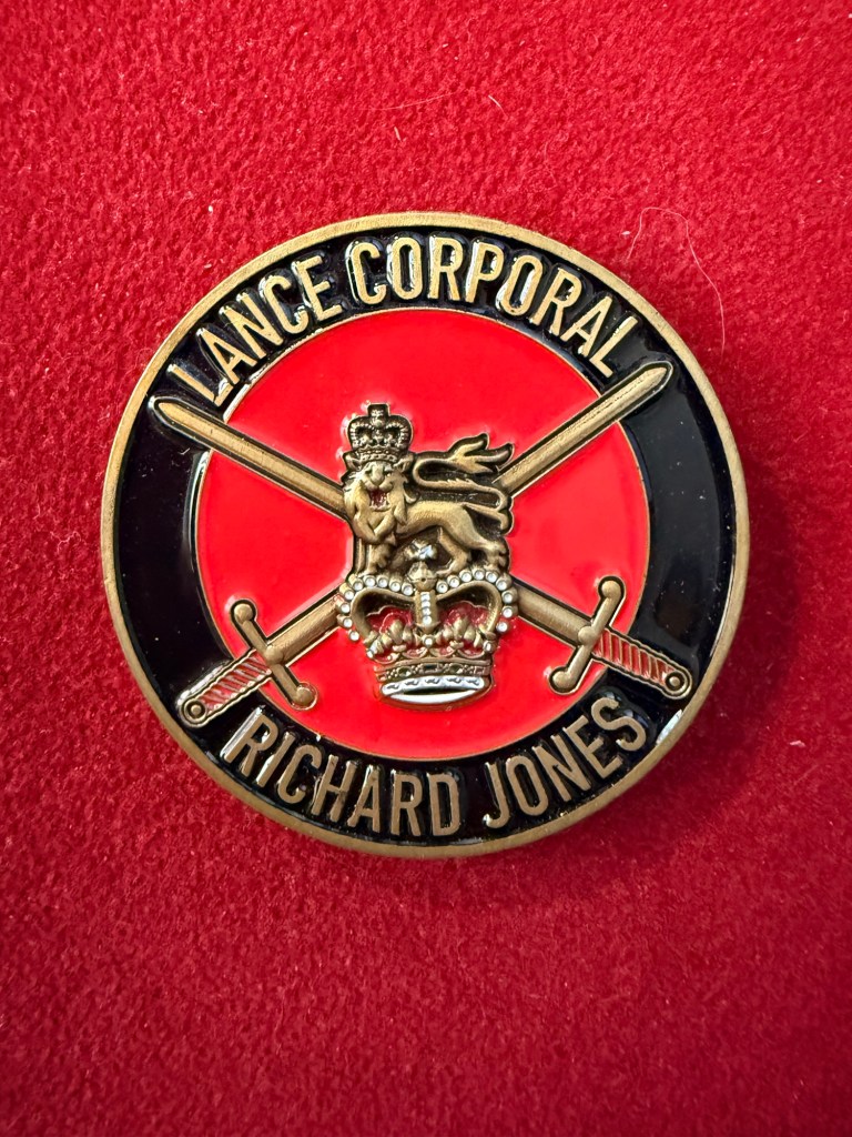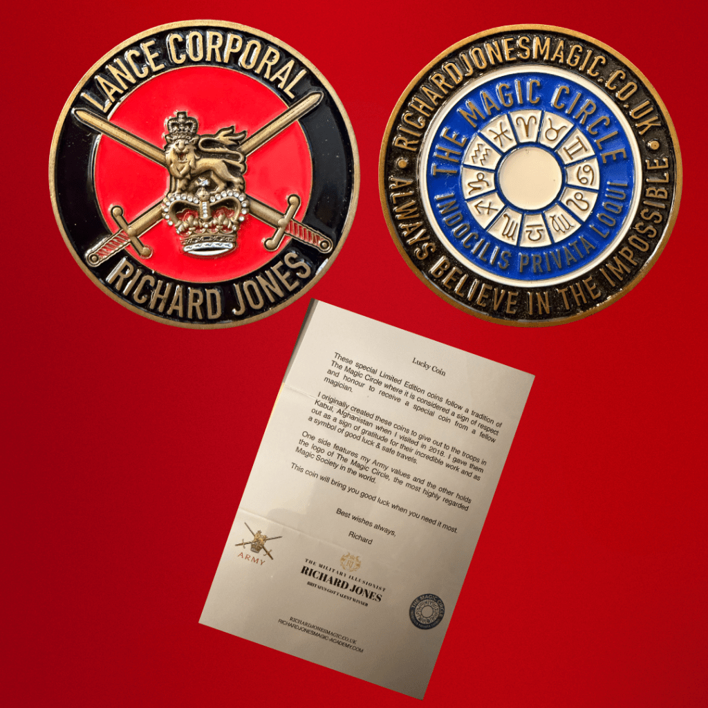 I do, of course, have many signed items, but one collectible that is likely harder to find is a challenge coin that I acquired from Richard. These are coins that the military distribute with an insignia or emblem to honour service members. The coin is personalised and has the Magic Circle logo on the reverse. I have this on display in a cabinet in my office. I also found stored away a sheet detailing the significance of the challenge coin.