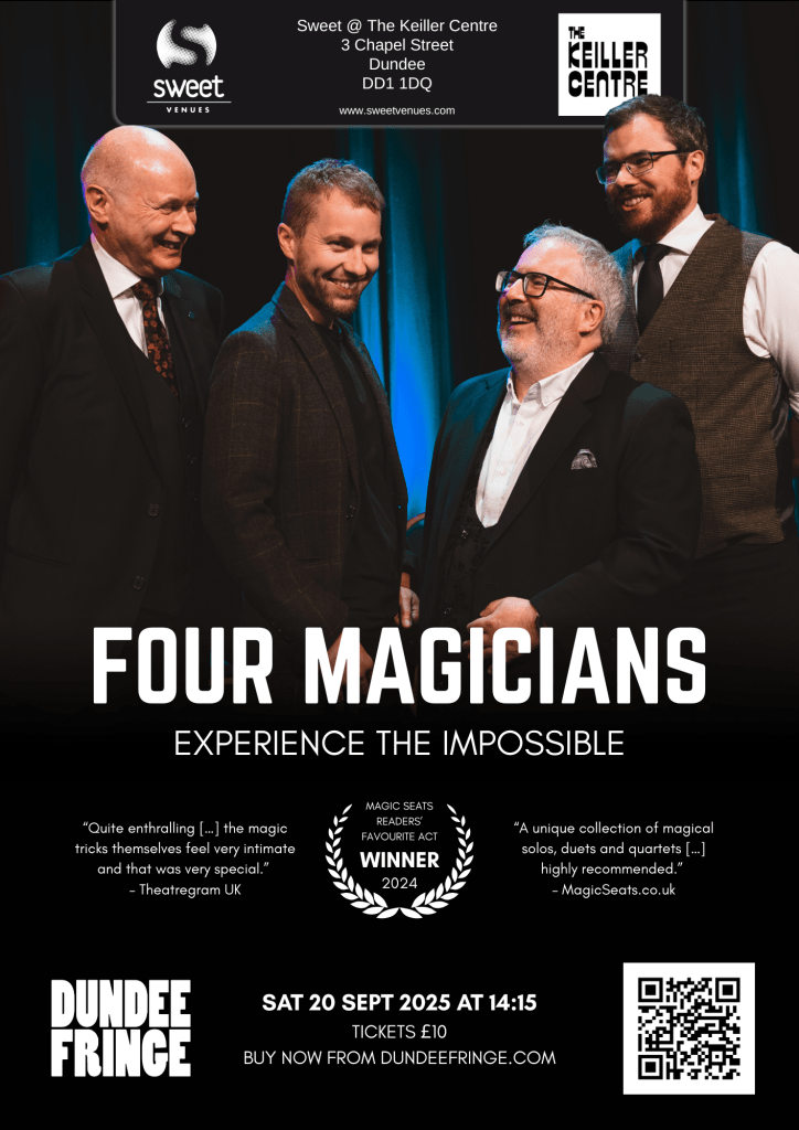 Four Magicians takes place at Sweet @ Keiller Centre on September 20, 2025 from 2.15pmas part of the fifth Dundee Fringe. For more information and to book tickets, visit https://dundeefringe.com/four-magicians.