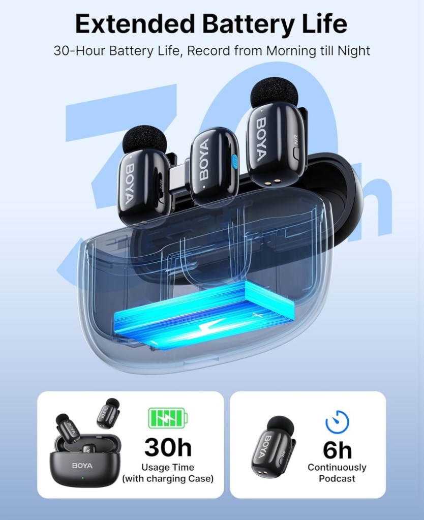 The charging case has a battery life of up to 30 hours, and the mics have a life of up to 6 hours between charges. The case is similar in size to Apple AirPods cases. The construction is pretty good.