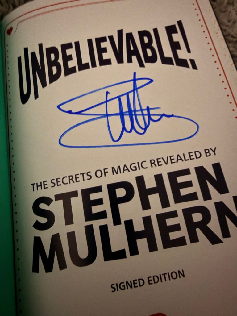 I was pleased to acquire the hardback edition of this limited signed book, which will join my other three signed Stephen Mulhern books: the Max Magic volumes 1 to 3. The glossy paper gives the signature a very nice, full appearance. It’s a high-quality book, well presented, and comprises 94 pages. This version also features a moving image of Stephen performing with a lenticular lens/print image, likely exclusive to this limited edition. I couldn’t confirm if the standard edition includes this feature, but I doubt it. The book’s target audience is children, but anyone interested in magic will appreciate this book.