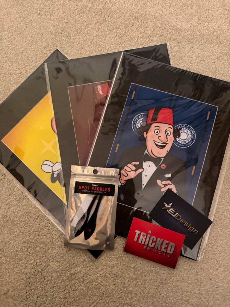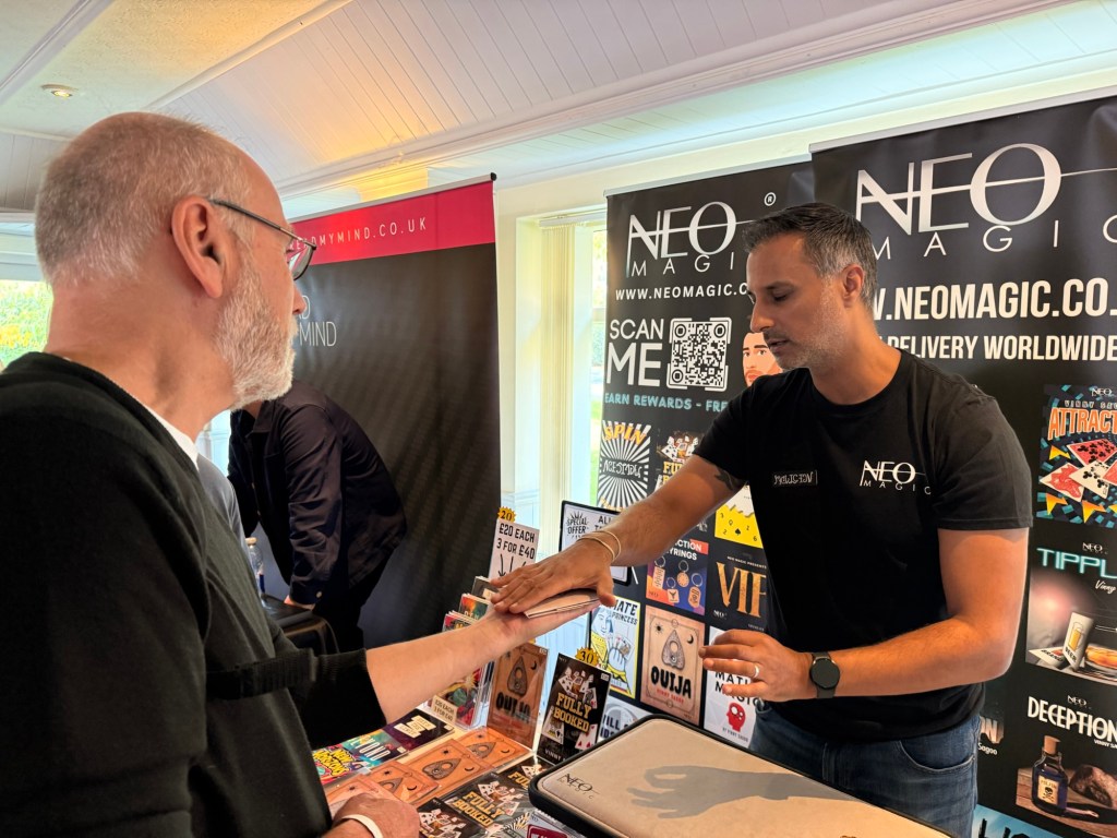 I was already sure of what I wanted to buy and I was impressed with all the dealers. Two of my favourites were present, Neo Magic and Tricked Magic. Vinny (Neo Magic) was busy running demos and chatting with everyone, so I picked up a couple of his products (see picture) and identified more I need to buy. Then, at the Tricked Magic stall, I could always buy loads of their stuff. I picked up some Tommy Cooper artwork and paddles.
