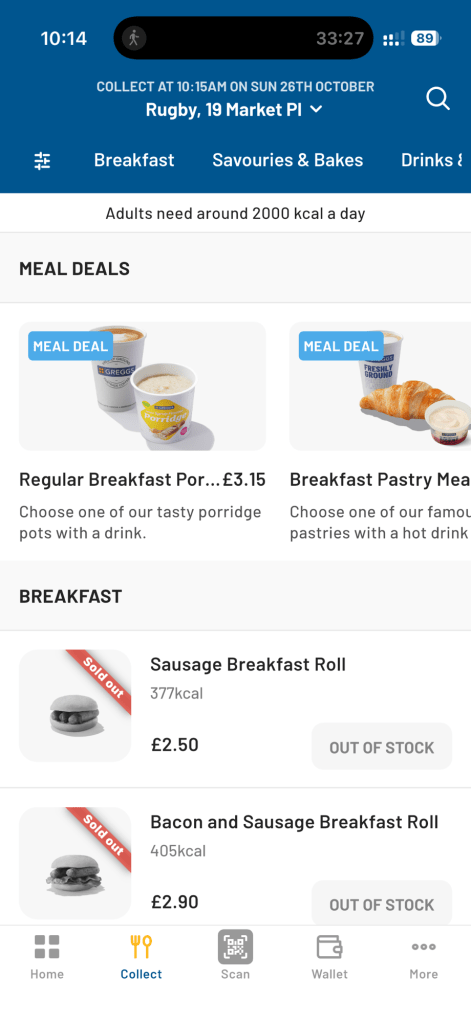 The “collect” tab helps you identify nearby stores to facilitate collection arrangements, allowing you to select a time slot before placing an order. The “scan/wallet” lets you top up funds and scan to allow payment, while also collecting rewards. The “wallet” section shows your accumulated rewards.