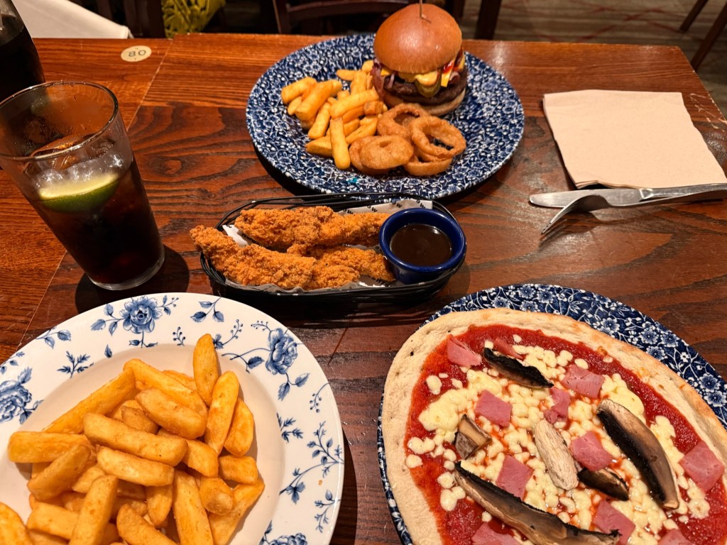 The food quality matches reasonable expectations for the low price and offer good value. My chicken strips were particularly tasty. The chips were decent too. The pizza was okay, it tasted good but I’d have liked the cheese to be more melted and didn’t look like the topping had been cooked long enough. My wife’s burger was also good for the price.