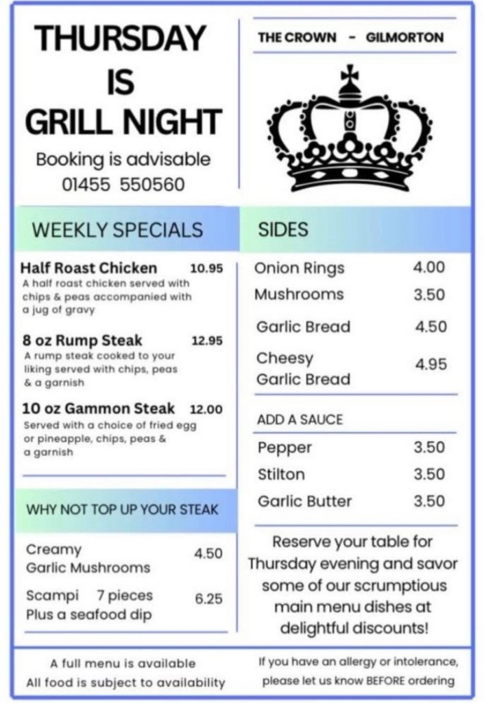 The Crown Inn in Gilmorton is a convenient local pub and restaurant to meet up with my sister. For birthday meals and general catch-ups, it is a good venue to eat, drink, and chat.