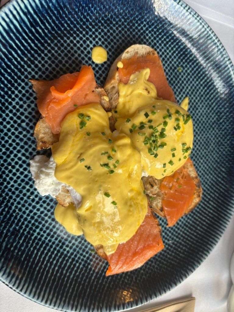 I understand the French bread was also lovely. The avocado feedback was that the portion was quite large, though everyone has different tastes and expectations. My wife enjoyed the eggs royale with smoked salmon and eggs.